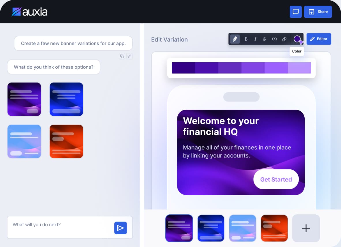 Auxia’s Content Agent has contextual awareness of your product and users, empowering your team to effortlessly create personalized, high-impact content for every customer.